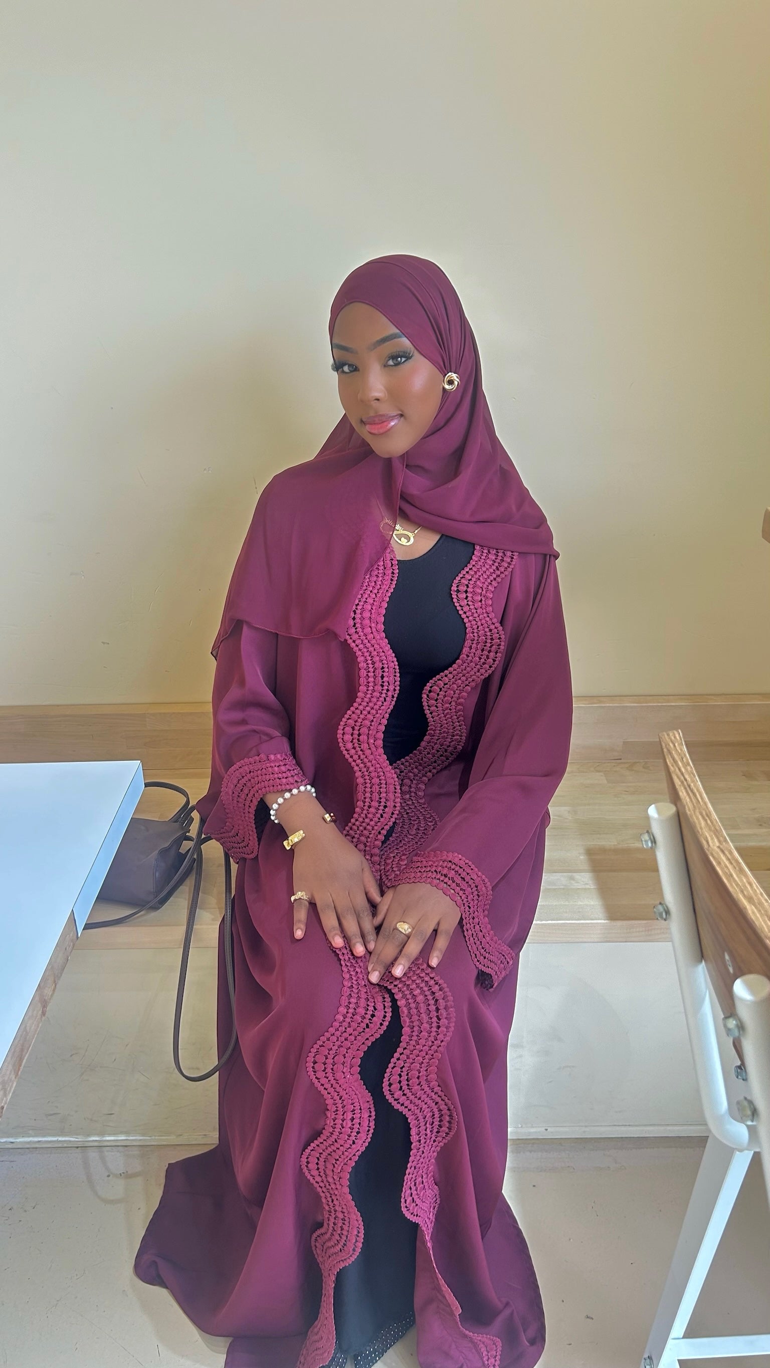 Designed in a rich ruby red shade, this abaya features intricate scalloped embroidery along the front and sleeves. Made from high-quality fabric, it offers both elegance and comfort—perfect for any occasion.